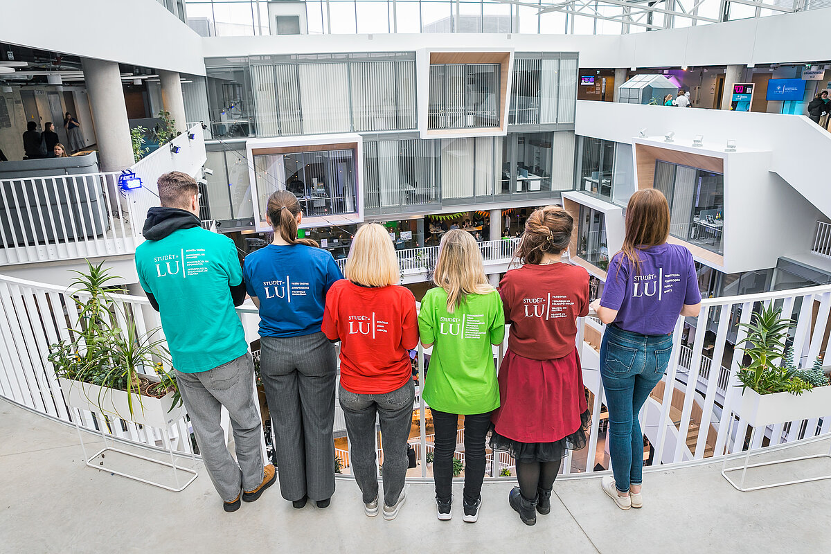 Studenti LU fakultāšu kreklos stāv Zinātņu mājas ātrijā
