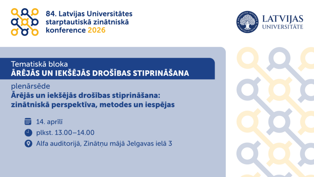 14. aprīlī plkst. 13.00 Latvijas Universitātes (LU) 84. starptautiskās zinātniskās konferences (LU84) ietvaros notiks tematiskās sesijas “Ārējās un iekšējās drošības stiprināšana” plenārsēde – paneļdiskusija, kurā drošības jautājumi tiks analizēti plašā starpdisciplinārā kontekstā, apvienojot dažādu zinātņu nozaru perspektīvas.