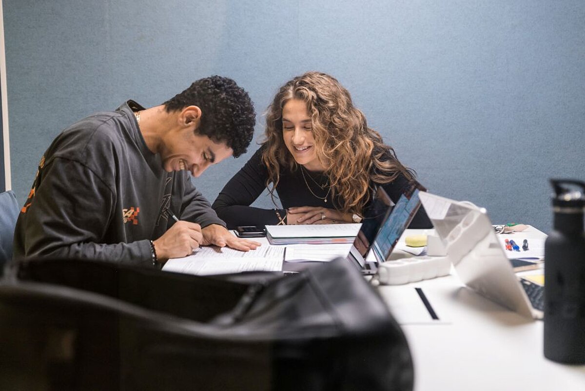 2 studenti pie galda, uz galda dators