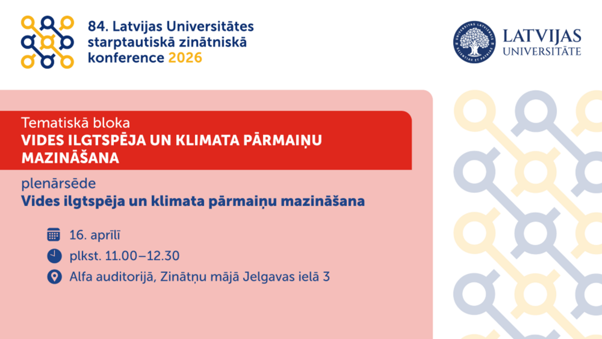 Tematiskās sesijas “Vides ilgtspēja un klimata pārmaiņu mazināšana” plenārsēde un sekcijas notiks klātienē LU Akadēmiskajā centrā, Zinātņu mājā (Rīgā, Jelgavas ielā 3) Dabas mājā (Jelgavas ielā 1). Atsevišķi notikumi būs pieejami attālinātai dalībai. Sesijas pasākumi notiks latviešu un angļu valodās, un to apmeklējums ir bez maksas. Reģistrācija ir atvērta līdz 11. aprīlim LU84 tīmekļvietnē konference84.lu.lv, izvēloties konkrētu sekcijas sēdi.