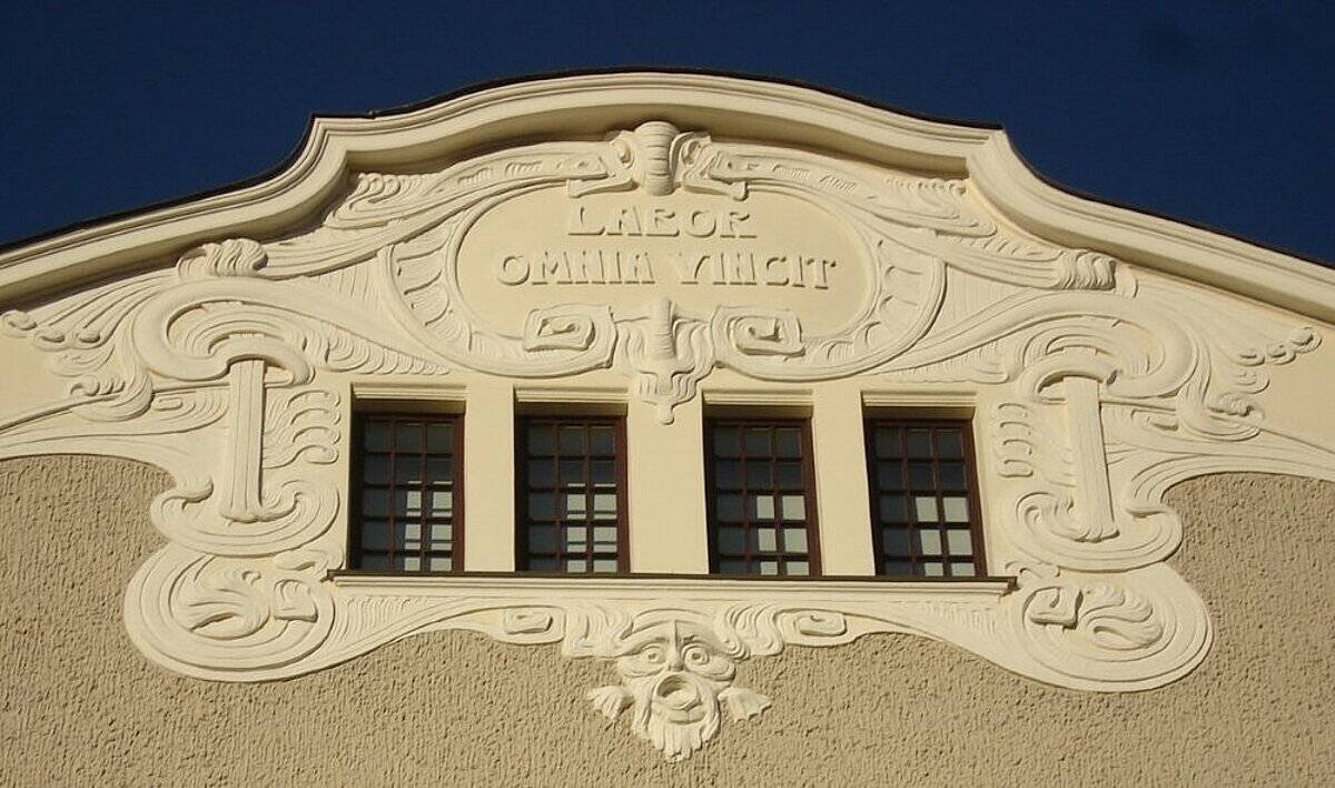 Ēkas fasādes augšdaļa ar bagātīgi veidotu dekoratīvu apmetuma reljefu, trīs logiem un centrā izvietotu latīņu uzrakstu “Labor omnia vincit”