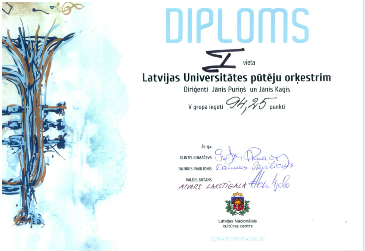 Latvijas Universitātes pūtēju orķestris savā grupā ieguva pirmo vietu.