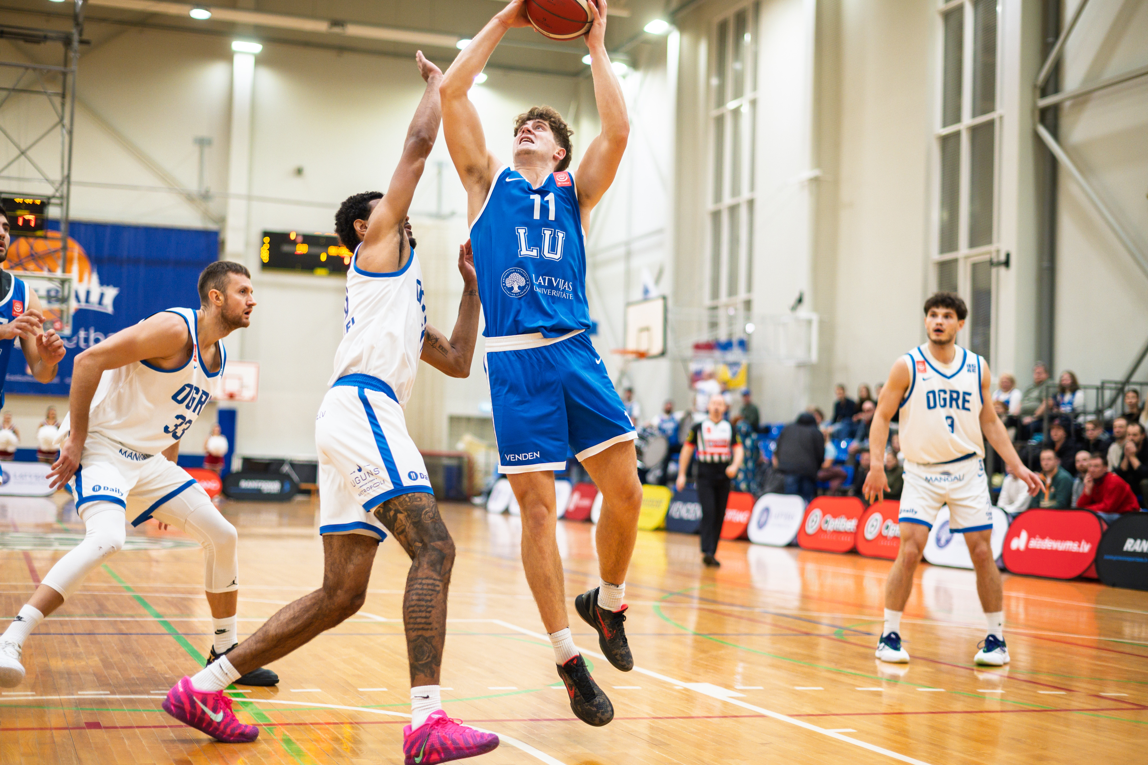 LU basketbola komanda demonstrē cīņassparu spēlē pret BK “Ogre”