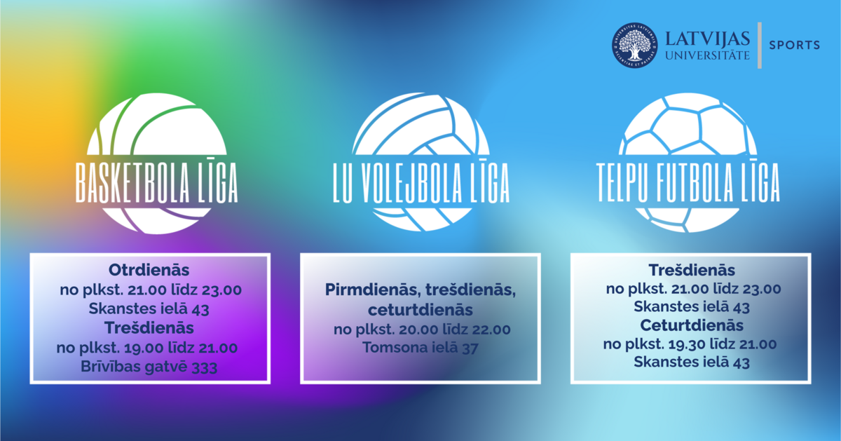 LU studentiem, mācībspēkiem un darbiniekiem tiek piedāvātas plašas sportošanas iespējas, un centrālo vietu ieņem tieši trīs līgas – basketbola, volejbola un telpu futbola. Tās ne tikai veicina aktīvu un veselīgu dzīvesveidu, bet arī ļauj regulāri pilnveidot sportiskās prasmes, spēlējot vienu līdz trīs reizes nedēļā. Katrā līgā notiek pamatturnīri, bet aprīlī un maijā norisināsies izslēgšanas spēles, kurās tiks noskaidrotas labākās komandas un individuāli izcilākie spēlētāji.