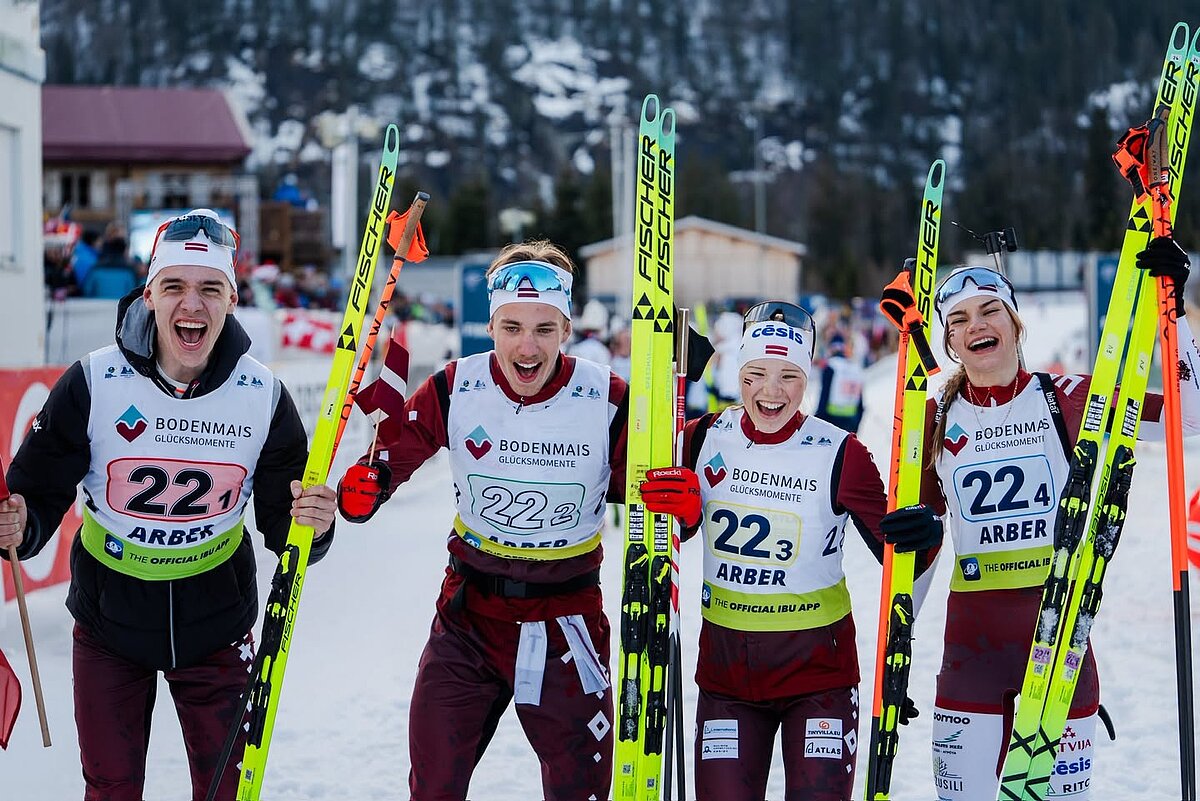 Latvijas komandu pārstāvēja Matīss Meirāns, Rihards Lozbers, Elza Bleidele un Estere Volfa. Distanci latvieši veica 1 stundā 17 minūtēs un 55,2 sekundēs, šautuvē iztiekot bez soda apļiem un izmantojot 15 rezerves patronas. Finišā Latvijas kvartets par 4,5 sekundēm apsteidza Norvēģijas izlasi, savukārt Francija ierindojās trešajā vietā, atpaliekot nepilnu minūti.