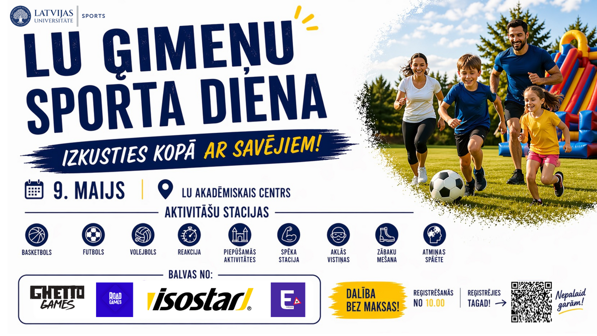 Latvijas Universitātes Sporta centrs regulāri organizē pasākumus, lai veicinātu veselīgu un aktīvu dzīvesveidu universitātes saimē, kā arī stiprinātu kopības sajūtu starp studentiem, darbiniekiem un viņu ģimenēm. Arī šogad viens no centrālajiem pasākumiem ir “LU Ģimeņu sporta diena”, kas piedāvās iespēju piedalīties dažādās netradicionālās un aizraujošās sporta aktivitātēs, kurās tiks pārbaudīta gan dalībnieku veiklība, gan sadarbības prasmes.