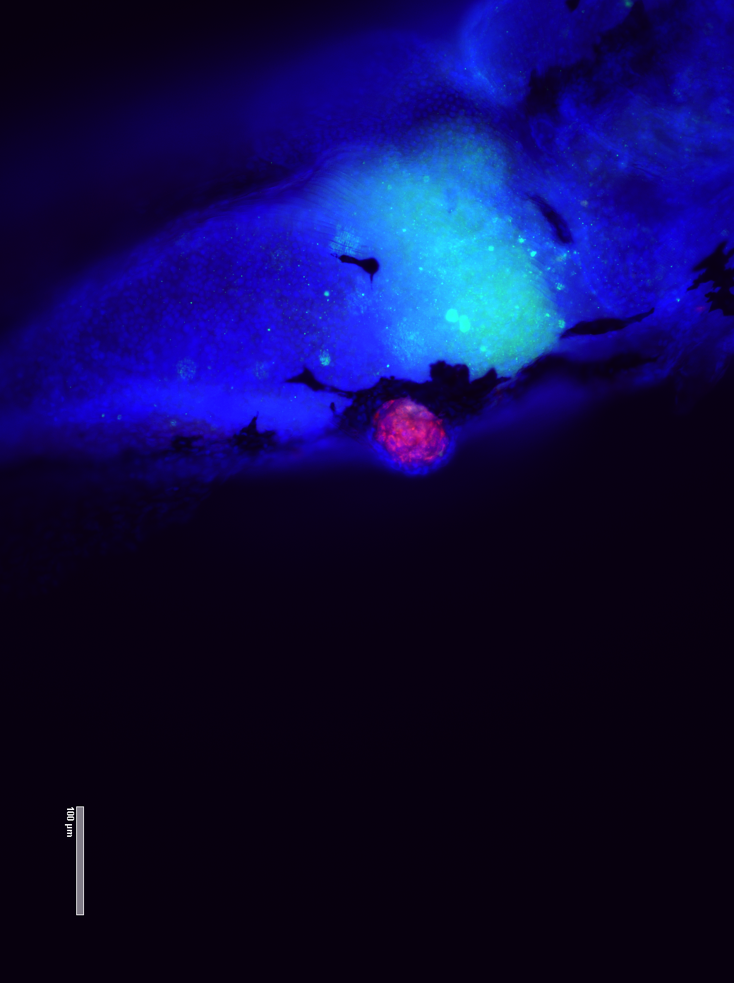 Attēlā aizkuņģa dziedzera audzēja šūnu ksenotransplantāts. Ar sarkanu ir iezimēti mitohondriji, kas palīdz identificēt cilvēka izcelsmes šūnas.