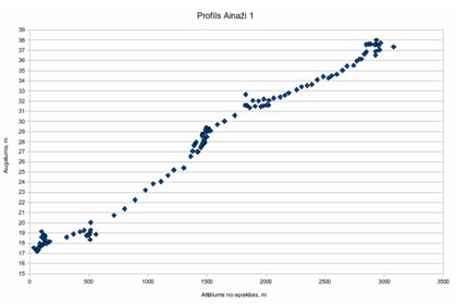2. att. Baltijas ledusezera seno krasta veidojumu augstas ģeodēziskās precizitātes līmetņošanas dati Ainažu šķērsprofila līnijā. Zemes virsmas lūzuma vietās punktu skaits ir sabiezināts ar mērķi iegūt detālāku informāciju.