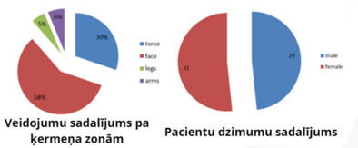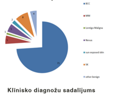 Projekta rezultāti: iesniegta publikācija – 3, konferenču materiāli – 1, zinātniskās monogrāfijas vai to manuskripti – 1, iesniegts projekta pieteikums – 2, aizstāvēts maģistra darbs – 1, citi pētniecības specifikai atbilstoši projekta rezultāti – jauna ļaundabīgu ādas veidojumu diagnostikas metodika un maketierīce